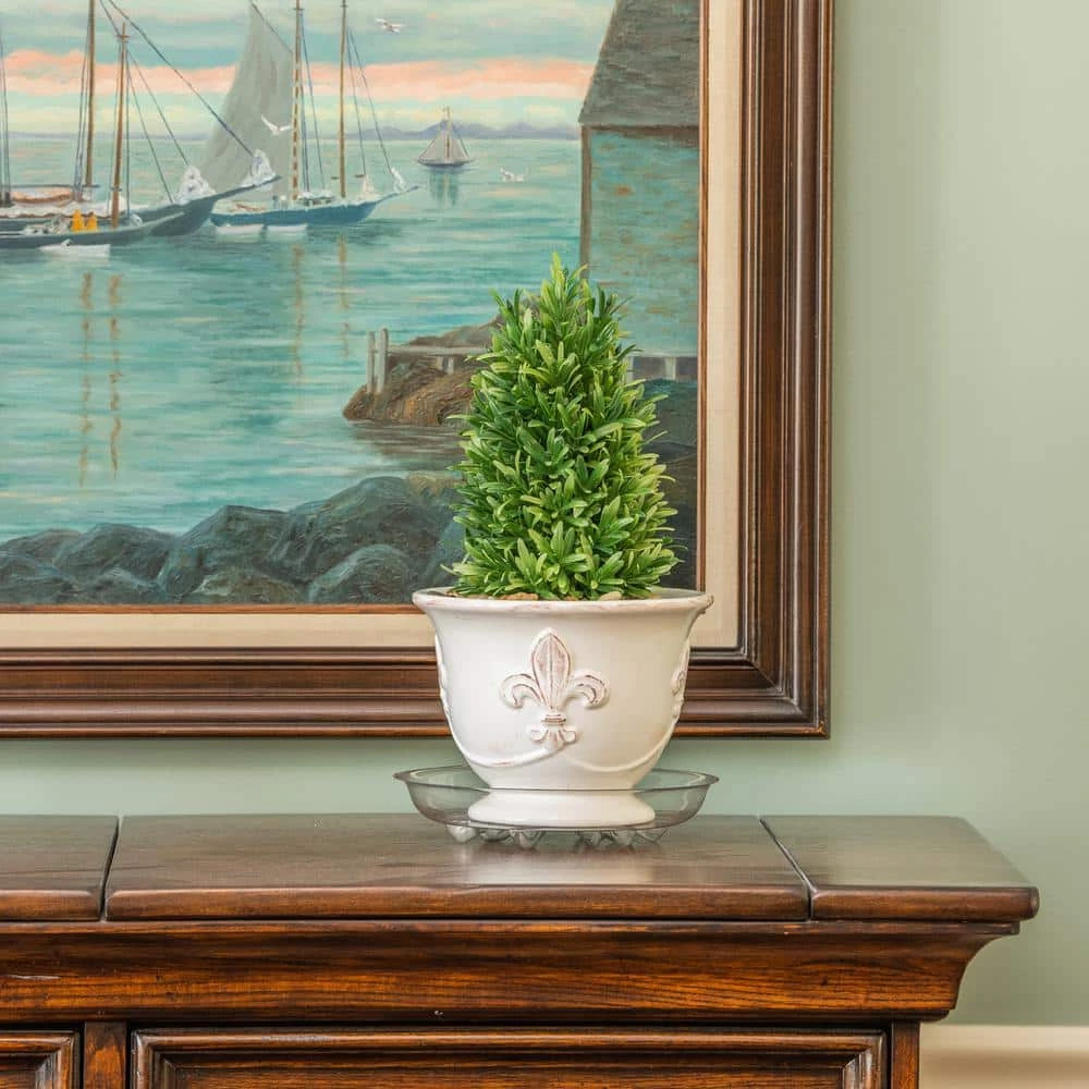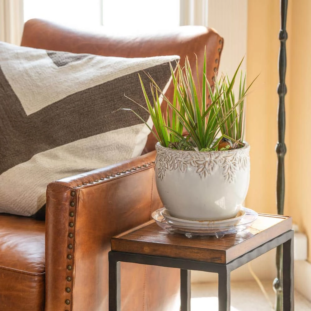 Clear saucer blends with ceramic, clay and plastic planters