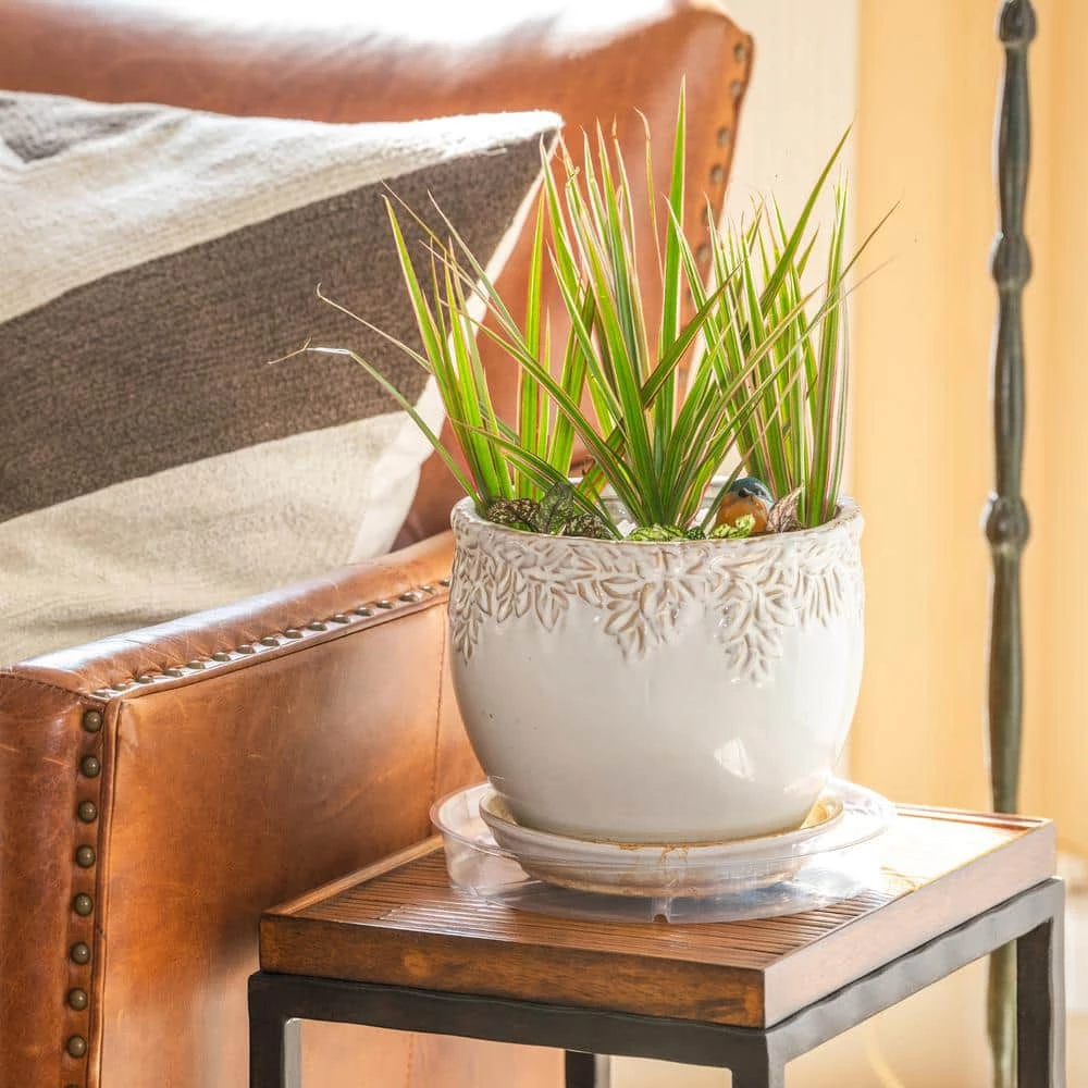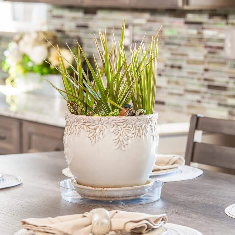 Clear saucer blends with ceramic, clay and plastic planters