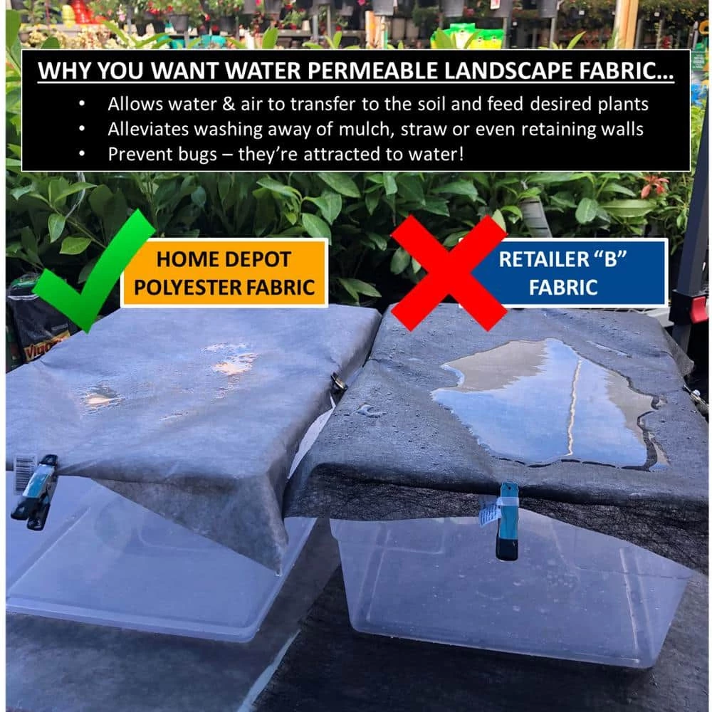 For quality landscape projects, you need materials that match the high quality of your work. That’s why Home Depot offers professional-grade landscape fabrics that last and are 100% guaranteed. The Vigoro polyester weed control fabric dramatically reduces weed growth by blocking sunlight and preventing weed germination. This is ideal for permanent landscapes and under pavers, patios and sidewalks where a highly durable fabric is required. Commercial weed control fabric has excellent strength to weight ratio, but great air and water permeability that allows your flowers and plants to grow. Stronger, thicker, professional strength landscape fabric for professional landscapers, contractors and everyday gardeners. This weed barrier landscape fabric is great for gardens, landscapes and hardscape projects with paver stones, pavers, edging, mulch, pine straw, rocks and much more.
